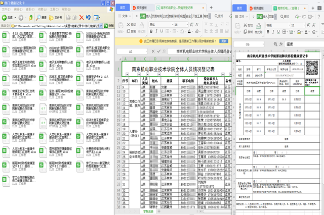 同时党办、院办还为全院教职工建立新冠肺炎防控健康登记档案,构架“院-系(部门)-班(个人)”三级健康安全网络。党办、院办的负责老师每日需要向省教育厅的江苏高职疫情防控组、江宁区教育局的驻江宁高校防控组、机电产业集团和麒麟街道汇报学院疫情防控工作开展情况、师生假期行踪、身体健康状况及在线教学工作、物资储备工作的开展情况。