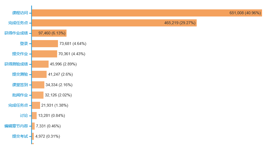 在线课程总课时4996课时,已建设完成3666课时,上传资源总数12463个,其中视频上传数3284个,文档资源数3212个,作业资源数2599个,其他资源数3368个。线上课程每日资源数都在增加,3月22日在线课程建设新增116课时,新增资源总数682个,其中视频上传数177个,文档资源数281个,作业资源数77个,其他资源数147个。