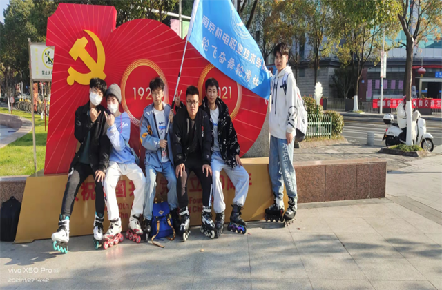 本次活动先是从学校出发,轮滑到团结圩地铁站,坐地铁抵达高淳区,在高淳区落点。社长组织成员们进行打卡。活动过程中,社长手举印有南京机电轮滑社旗帜,带领社团成员排成一列,匀速滑往各个打卡点。一路上,成员们欢声笑语,兴致昂扬,没有抱怨。在阳光的照耀下,在马路的一边形成了一支鲜明的队伍。活动打卡了七个地点,有:湖滨广场、人民广场、高淳老街、福克斯广场……每一个驻足的地方都有着“庆祝建党百年”的标志。