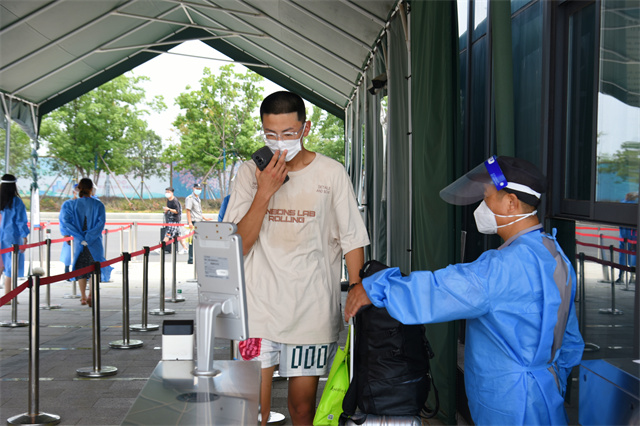 报到现场秩序井然,返校学生严格遵守“扫码核验——查验体温——卫生消杀”等程序进入校园。学工处、保卫处、后勤处及各系部分工协作、密切配合,做好学生返校报到现场周边的秩序维护和身份核验、交通管制引导、行李消杀等工作,为学生安全平稳有序返校保驾护航。