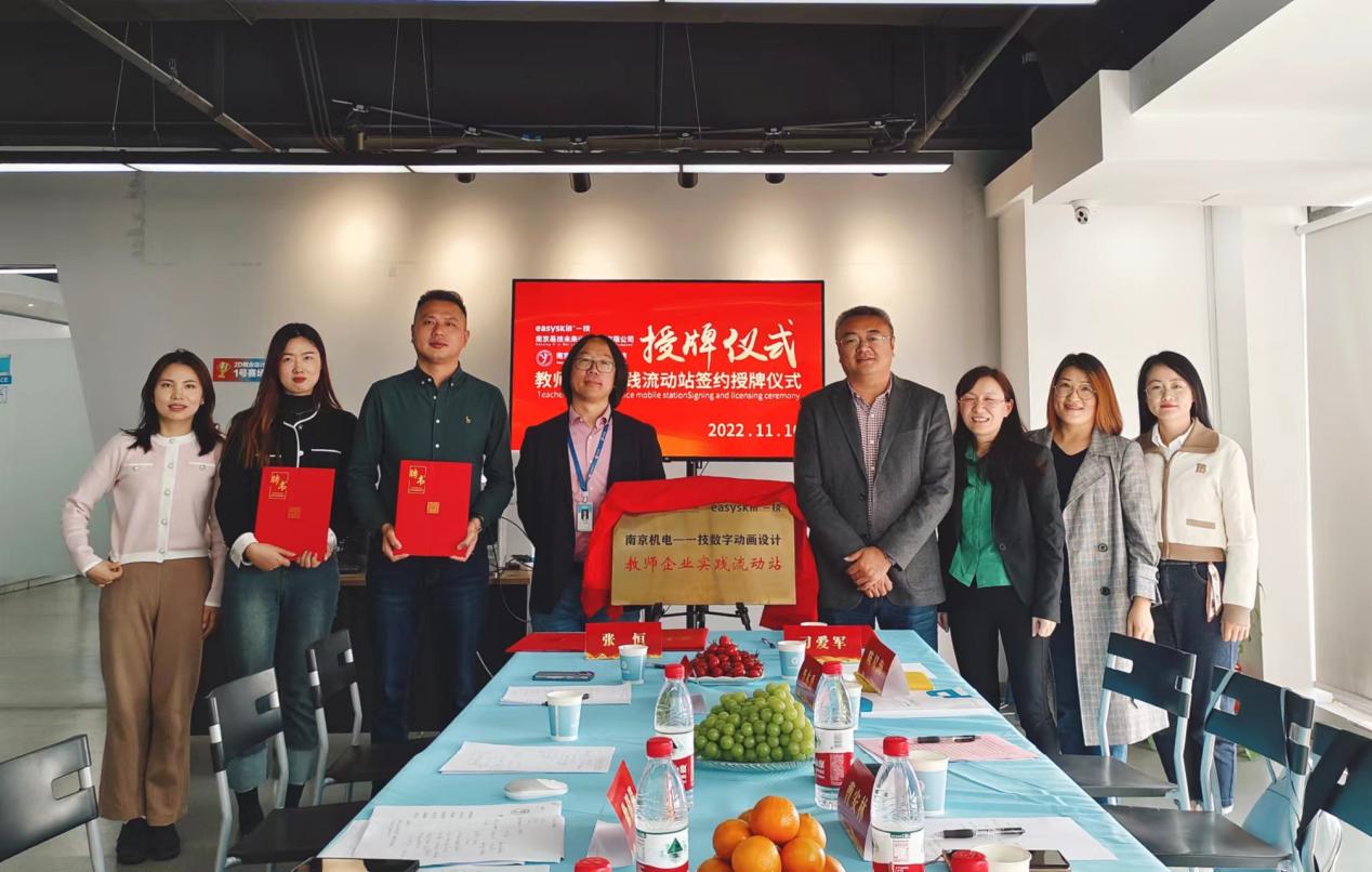 为全面促进校企交流合作,着力打造校企共建、产教融合平台,2022年11月10日,幻影网页版登录入口_幻影(中国)赴南京易技未来动画制作有限公司举行“南京机电-一技数字动画设计教师企业实践流动站”签约揭牌仪式。我院党委委员、副院长刁爱军、科研与校企合作处处长李木香、人文社科系系主任曹安林、人文社科系系部书记叶绘及数字媒体技术专业相关教师与南京易技未来动画制作有限公司董事长张恒、总经理王群及流动站企业联络人徐倩倩共同见证了这一重要时刻。