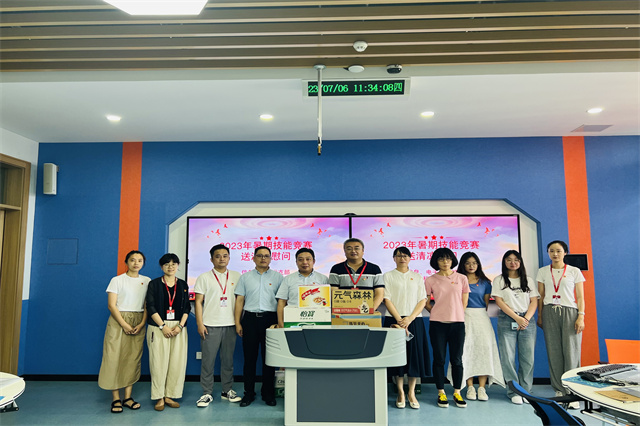 今年暑期,我系共有15名师生留校奋战在备赛的火热氛围中。在此次慰问活动中,系主任姚小冬介绍本次暑期技能竞赛送清凉慰问活动,表达了对高淳移动党支部一行的感谢与支持;高淳移动党支部书记、经理蔡璨对两系技能竞赛团队给予亲切的关怀并给予厚望,表示本次行动不仅送来了丝丝凉意,也给炎炎夏日带来了一丝惬意、一阵清风,希望把关怀真正送到师生的心坎里,同时鼓励在场师生要鼓足干劲,永争第一。