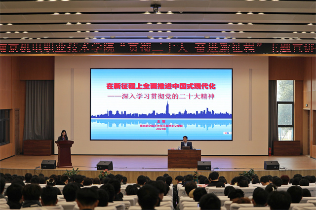 会议邀请到江苏省委宣讲团成员、南京航空航天大学马克思主义学院院长、教授、博士生导师王智以《在新征程上全面推进中国式现代化——深入学习贯彻党的二十大精神》为题作主题宣讲。王教授从中国式现代化与全面推进中华民族伟大复兴的历史进程、在新时代历史性成就和历史性变革中开启新征程等四个方面系统梳理了中国式现代化的科学内涵、鲜明特色、本质要求和前进道路上必须牢牢把握的重大原则,同时全面对标对表党的二十大作出的战略部署和安排,为我校师生深入解读了习近平总书记为江苏擘画的建设“强富美高”新江苏的宏伟蓝图。