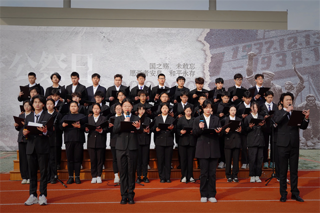 上午十时整,全校师生面向国旗台肃立,齐声高唱国歌,国歌唱毕,随着防空警报的拉响,全体师生为南京大屠杀死难者沉痛默哀。