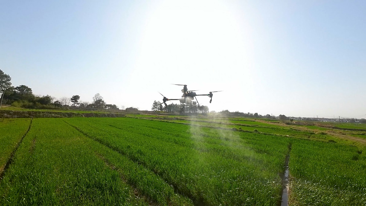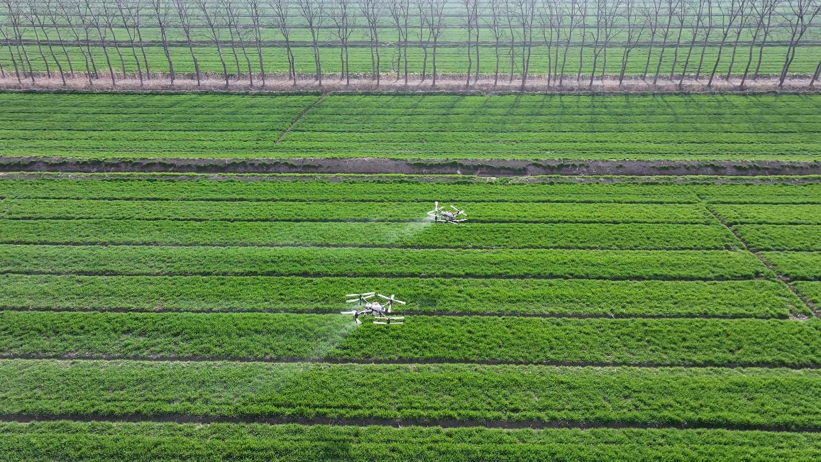 伴随着螺旋桨的轰鸣声,一阵风卷起地面的尘土,一架无人机腾空而起,预防病虫害的农药从喷口中均匀洒出,形成细密的雨雾,轻轻覆盖在麦苗上,在阳光下闪闪发光。