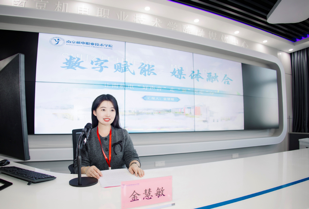 金慧敏作《数字赋能,媒体融合——让南机电“好声音”走“新”更走“心”》汇报,概述学校2024年度新闻宣传工作开展情况。