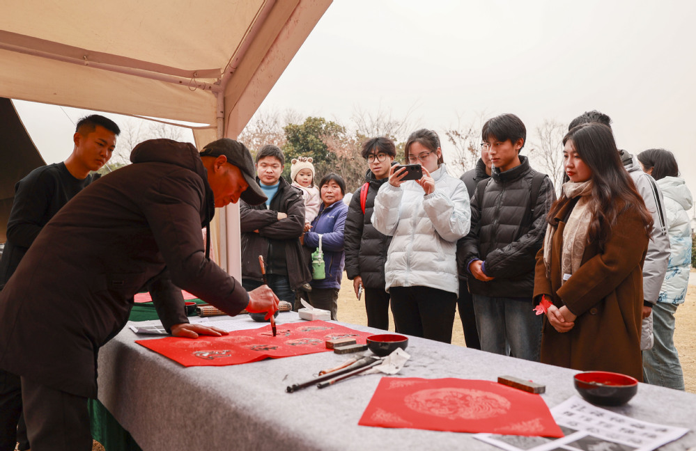 活动现场,书画爱好者们齐聚一堂,挥毫泼墨,用笔尖传递情感和祝福。不时有同学与村民和游客一起与当地书法家进行互动,书法爱好者耐心指导学生写福字,并一起将写好的“福”和春联送给群众。