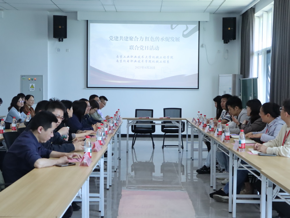 为深入贯彻落实党的二十届三中全会和中央八项规定精神学习教育部署,强化党建与业务深度融合,持续推进“头雁领航·伴飞同行”专业建设1+1帮扶计划,2025年4月26日,在南京工业职业技术大学机械工程学院党委书记刘英慧、副院长胡道春的带领下,南京工业职业技术大学机械工程学院第一党支部、第二党支部和第三党支部的党员教师团队莅临我校,与机械工程系党支部共同举办了以“党建共建聚合力,红色传承促发展”为主题的联合党日活动。南京工业职业技术大学机械工程学院党委副书记赵颖、副院长吴修娟、余旺旺、张海涛等领导同志亦参与了此次活动。