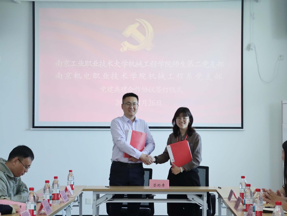 随后,胡枫书记与杨涛书记分别代表机械工程系党支部与南京工业职业技术大学机械工程学院机械设计制造及自动化党支部签订了党建共建协议,充分发挥党建引领作用,形成资源共享、优势互补的协同发展机制。