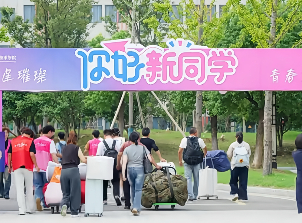 接站志愿者如星火般遍布各大交通枢纽,高举指引牌,第一时间接过沉甸甸的行李,用微笑熨平旅途的倦意;他们耐心答疑,一路讲解校园设施与报到流程,让“初来乍到”化作“初见如家”。迎新志愿者则织就一张流动的心网,穿梭校园、跨越楼层。行李车上堆满期待,指路声中洋溢关切,汗水折射阳光,也折射“奉献、友爱、互助、进步”的誓言。南小电志愿服务队350名成员,以脚步丈量责任,以热情点亮秋色,成为这个九月最亮丽的风景线。