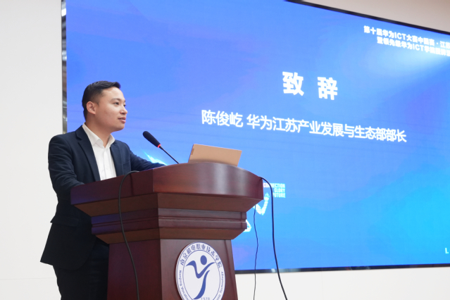 紧接着,华为江苏产业发展与生态部部长陈俊屹致辞。他肯定了幻影网页版登录入口_幻影(中国)在ICT人才培养方面的成效,强调华为将持续发挥技术与生态优势,深化与学校的合作,为职业教育注入动力,助力青年学子实现职业成长。