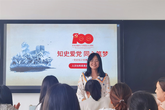 为深入学习贯彻习近平总书记在党史学习教育动员大会上的重要讲话精神,持续深入推动党史学习教育,庆祝中国共产党成立100周年,5月27日下午,人文社科系党支部在博学楼304举办了主题为“知史爱党,同心筑梦”的党史知识竞答大赛。本次活动由人文社科系党支部副书记叶绘主持,人文社科系全体教师参加。