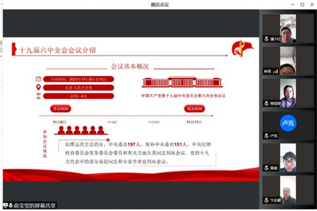 本次学习由支部组织委员俞宝莹同志主讲,主题为“深入解读十九届六中全会精神”。俞宝莹同志首先介绍了十九届六中全会的召开时间、参会人员、主要议程等基本情况。随后,她就“为何要总结党的百年奋斗重大成就和历史经验”这个问题作了深刻的讲解,她表示,全会要求全党要坚持唯物史观和正确党史观,从党的百年奋斗中看清楚过去我们为什么能够成功、弄明白未来我们怎样才能继续成功,从而更加坚定、更加自觉地践行初心使命,在新时代更好坚持和发展中国特色社会主义。