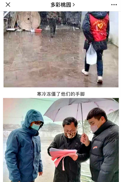 宅在家中不外出,是勇担责任的体现,在做好防护措施的同时,主动参与到疫情防控一线的人,是最美逆行者。应用电子182班的洪帅同学自愿报名抗“疫”志愿者,并协助派出所民警,对丁牙村和苏河村的村民进行挨家挨户的走访,开展该社区疫情防控“梳网清格”再走访活动,即便风雪交加也无法阻挡他前行的脚步。