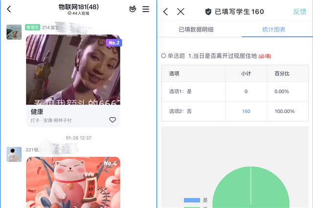 虽然我们相隔千里,但网络成为我们沟通的最佳桥梁,自1月26日起,为了有效防控疫情,辅导员需每日落实每位学生的健康状况,学生们也自发的在班级群中进行健康打卡。就这样,从最初的碎片式统计,到后期运用APP对学生的健康数据进行科学汇总,按时填写健康日报已经成为我们师生达成的默契,这既是责任也是爱。