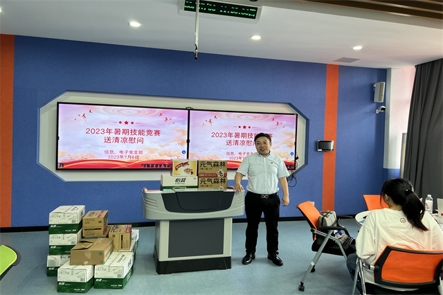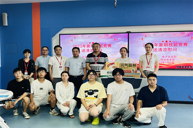 今年暑期,我系共有15名师生留校奋战在备赛的火热氛围中。在此次慰问活动中,系主任姚小冬介绍本次暑期技能竞赛送清凉慰问活动,表达了对高淳移动党支部一行的感谢与支持;高淳移动党支部书记、经理蔡璨对两系技能竞赛团队给予亲切的关怀并给予厚望,表示本次行动不仅送来了丝丝凉意,也给炎炎夏日带来了一丝惬意、一阵清风,希望把关怀真正送到师生的心坎里,同时鼓励在场师生要鼓足干劲,永争第一。