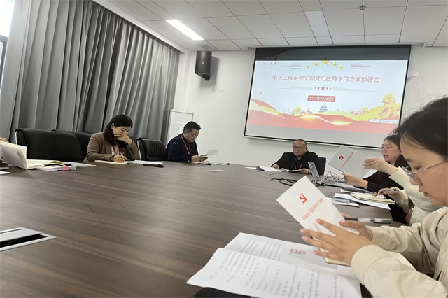 根据《中共中央办公厅关于在全党开展党纪学习教育》的通知和上级党委以及校党委《关于在党员干部中开展党纪学习教育工作方案》,4月28日电子工程系党支部举办在党员中开展党纪学习教育的部署会,要求所有党员干部深入学习贯彻习近平总书记关于党纪学习教育的重要讲话和重要指示精神,认真学习《中国共产党纪律处分条例》,教育引导党员干部学纪、知纪、明纪、守纪,推动党纪学习教育走深走实。会议由电子工程系党支部副书记陈雪主持,校党委副书记、副校长赵学洪出席会议,电子工程系全体党员参加。
