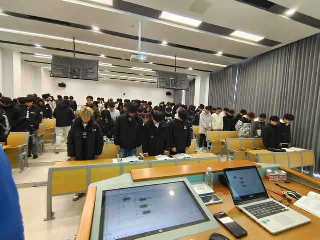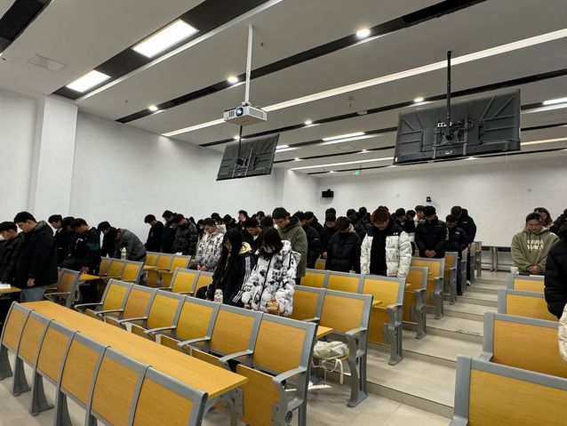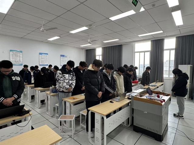 在悼念活动中,电子工程系的师生们严格按照活动安排执行。当防空警报响起时,无论是在教室还是办公室,所有师生都迅速站起,面向国旗方向肃立,神情肃穆地进行默哀。整个校园内弥漫着庄重而肃穆的氛围,每个人都沉浸在对历史的沉思和对逝者的哀悼中。