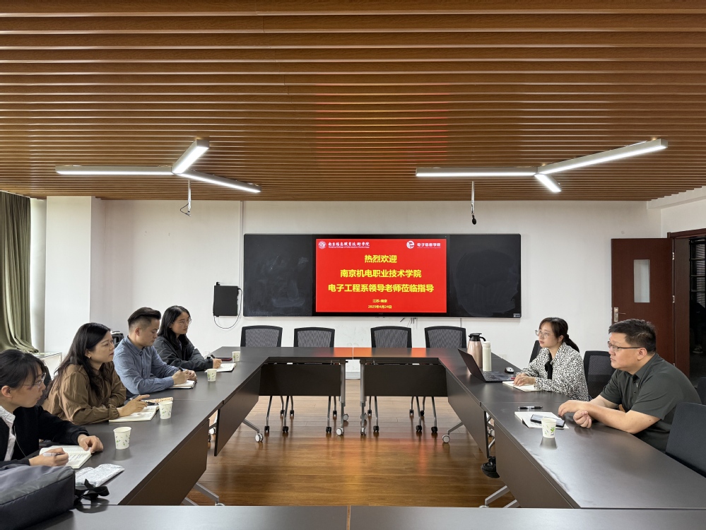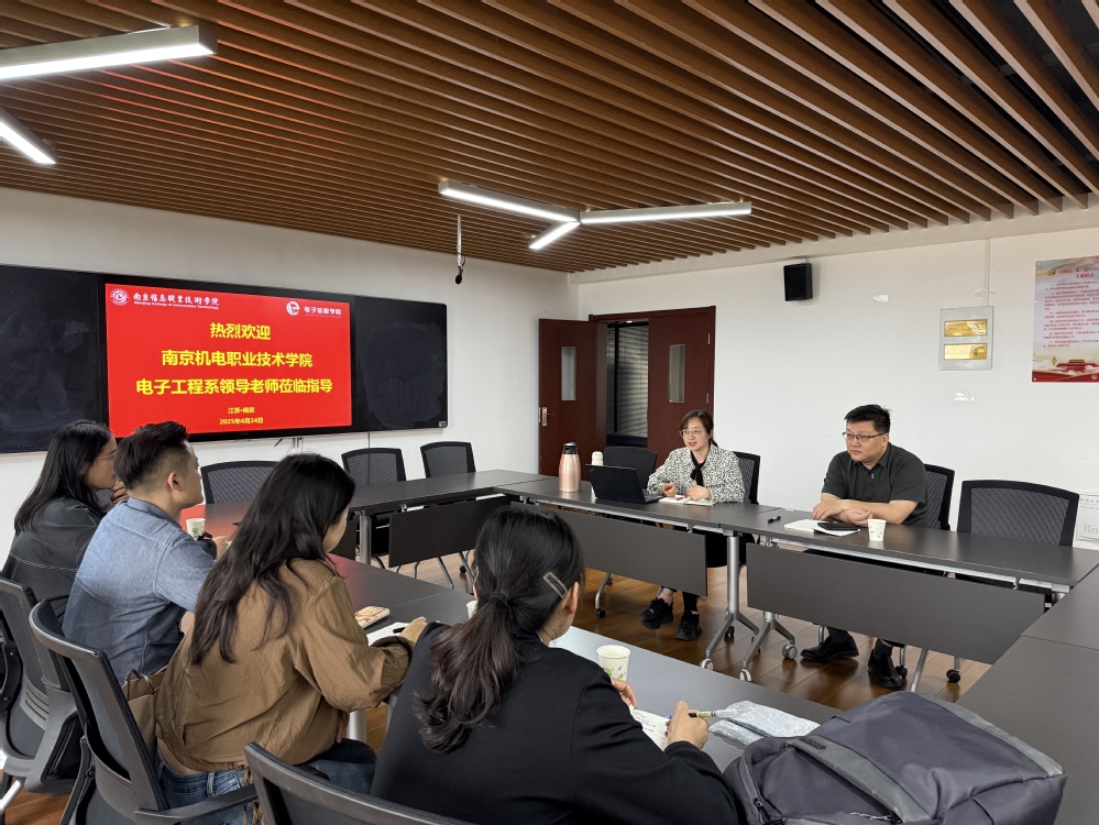 为落实“头雁领航·伴飞同行”1+1帮扶计划,深化高职院校合作,促进资源共享与优势互补,推动电子信息工程技术专业高质量发展,2025年4月24日,我校电子工程系赴南京信息职业技术学院电子信息学院开展专题研讨,共商专业建设新路径,携手谱写教育合作新篇章。南京信息职业技术学院电子信息学院副院长魏欣、电子教研室主任麻钰娟,电子工程系主任姚小冬、副主任丁向琴,专业教师郭晓凤、权海平共同出席本次研讨会。