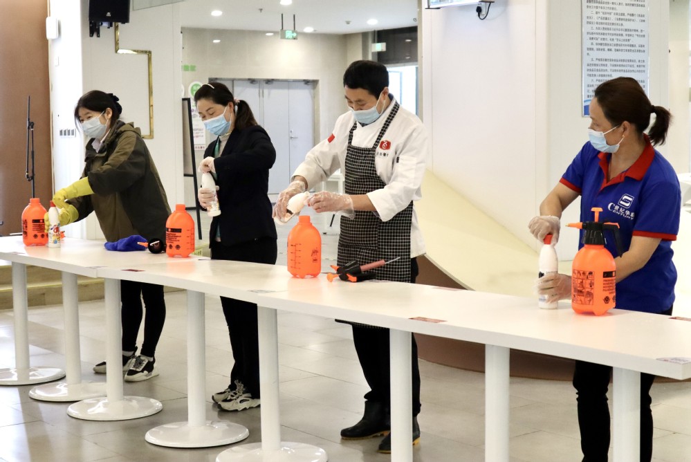 本次技能大比拼在学生餐厅一楼与二楼同时开展,共有包粽子、切土豆丝、打菜一勺准、清理餐桌、消毒水配兑与消杀5个项目。现场气氛热烈,员工情绪高涨,比赛内容将每天日常工作融入其中,员工的参赛体验感和操作实践水平得到了双向提升。