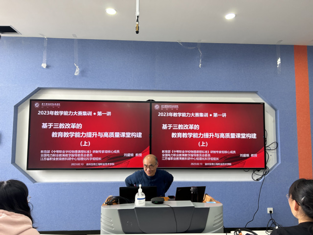为深入学习习近平总书记对职业教育工作的重要指示和全国职业教育大会精神,根据《关于深化现代职业教育体系建设改革的意见》、《关于推动现代职业教育高质量发展的意见》等文件要求,全面推进职业院校教师、教材、教法“三教”改革,创新人才培养模式,提升职业教育质量, 2023年4月11日,机械工程系全体老师在思学楼410教室,参加了以《基于三教改革的教育教学能力提升与高质量课堂构建》为主题的院级大教研,主讲人为南京铁道职业技术学院的刘盛烺教授。刘教授成功申报与建设国家级“中国特色高水平高职学校和专业建设计划”、国家级“优质专科高等职业院校”、“教育部现代学徒制试点项目”等近20项国家级项目。荣获国家教学成果二等奖1项,江苏省教学成果一等奖、二等奖等荣誉。