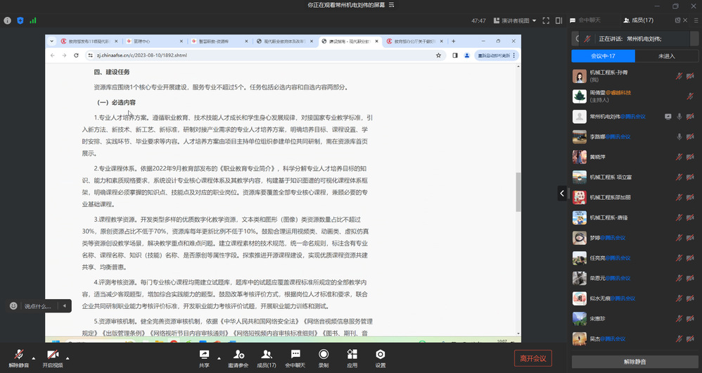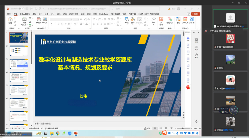 职业教育专业教学资源库建设是顺应“互联网+”发展趋势,推动信息技术在职业教育专业教学改革与教学实施领域综合应用的重要手段。为了更好地推动我校资源库建设,2024年8月23日上午午,机械设计与制造教研室全体教师通过线上的方式听取专家对资源库平台建设的指导。