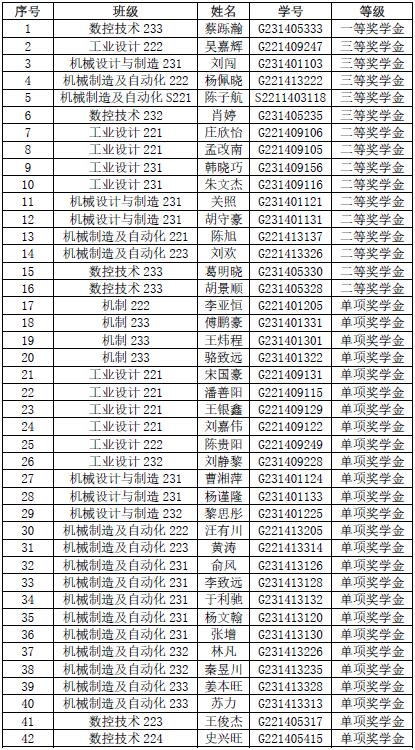 为激励在校大学生勤奋学习,努力进取,在德、智、体、美、劳等方面得到全面发展,同时也为了资助在校品学兼优的学生顺利完成学业,根据教育部、财政部及省教育厅、财政厅国家奖助学金相关管理规定和《幻影网页版登录入口_幻影(中国)奖学金评选及管理办法》(南机电院学〔2023〕23号)要求,机械工程系认真组织评选工作,经过本人申请,班级评议,现将2023-2024学年幻影网页版登录入口_幻影(中国)奖学金公示如下: