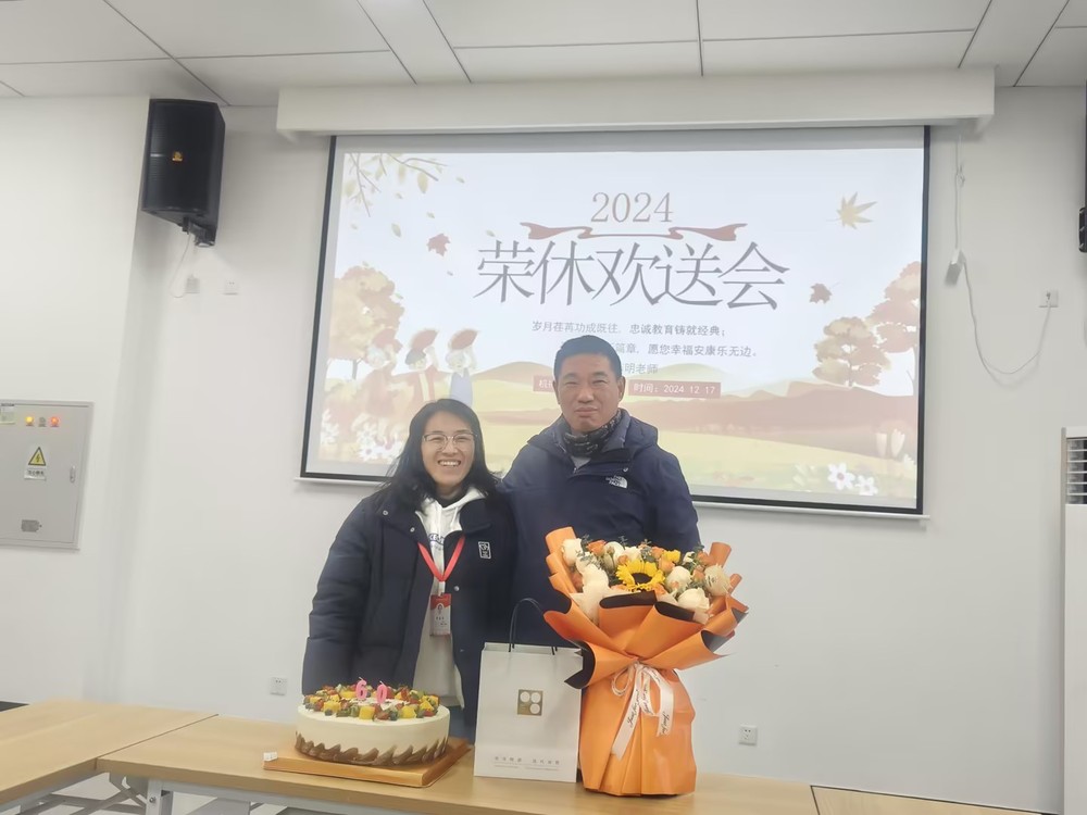 在全场热烈的掌声中,系部领导送上鲜花和纪念礼品。这份荣誉象征着学校和系部对他多年辛勤付出的高度认可与深深敬意。接过纪念品薛明老师感慨万千,他说道:“回首在机械工程系的岁月,心中满是感恩与不舍。感恩学校和系部给予我的肯定,同时让我能够与一群优秀的同事共事,见证一届又一届学生的成长与进步;不舍那熟悉的校园、可爱的学生和亲爱的同事们。虽然即将离开工作岗位,但我对教育事业的热爱永不磨灭,我会一如既往地关注学校和系部的发展,期待年轻一代的教师们能够传承和发扬机械工程系的优良传统,为培养更多优秀的专业人才而努力奋斗。”