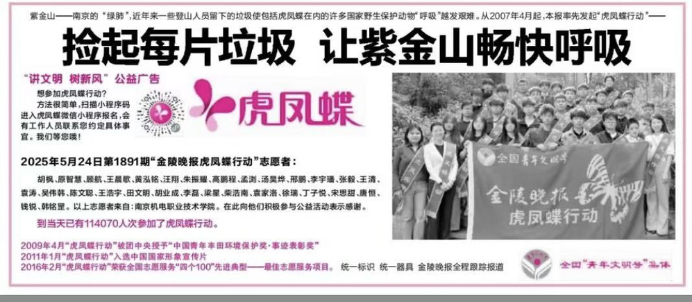 为进一步激发机械工程系师生的环保意识和奉献精神,5月24日上午,机械工程系党支部书记胡枫,学工干事原智慧,团委书记王晨歌带领30名团学骨干前往南京紫金山开展“虎凤蝶”志愿者行动。通过党建带团建,以实际行动守护自然环境,推动绿色发展。