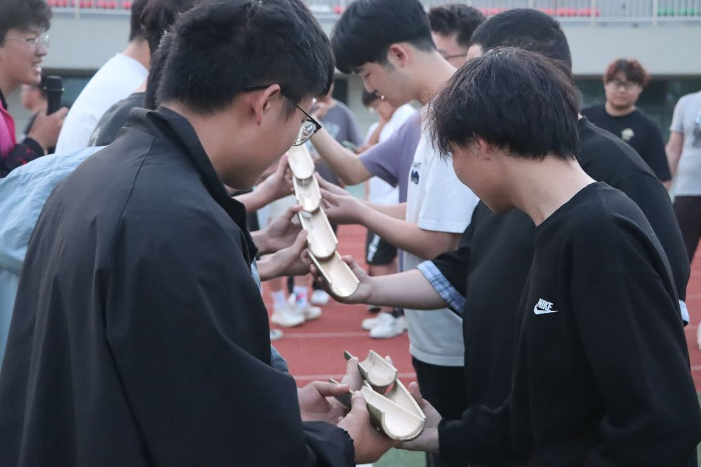 一鼓作气——团队运水赛:9名学生用特制凹槽板接力运送“生命之水”,途中需保持平衡避免洒漏。该项目人数最多、难度最大,充分展现个人平衡力与团队协作力。