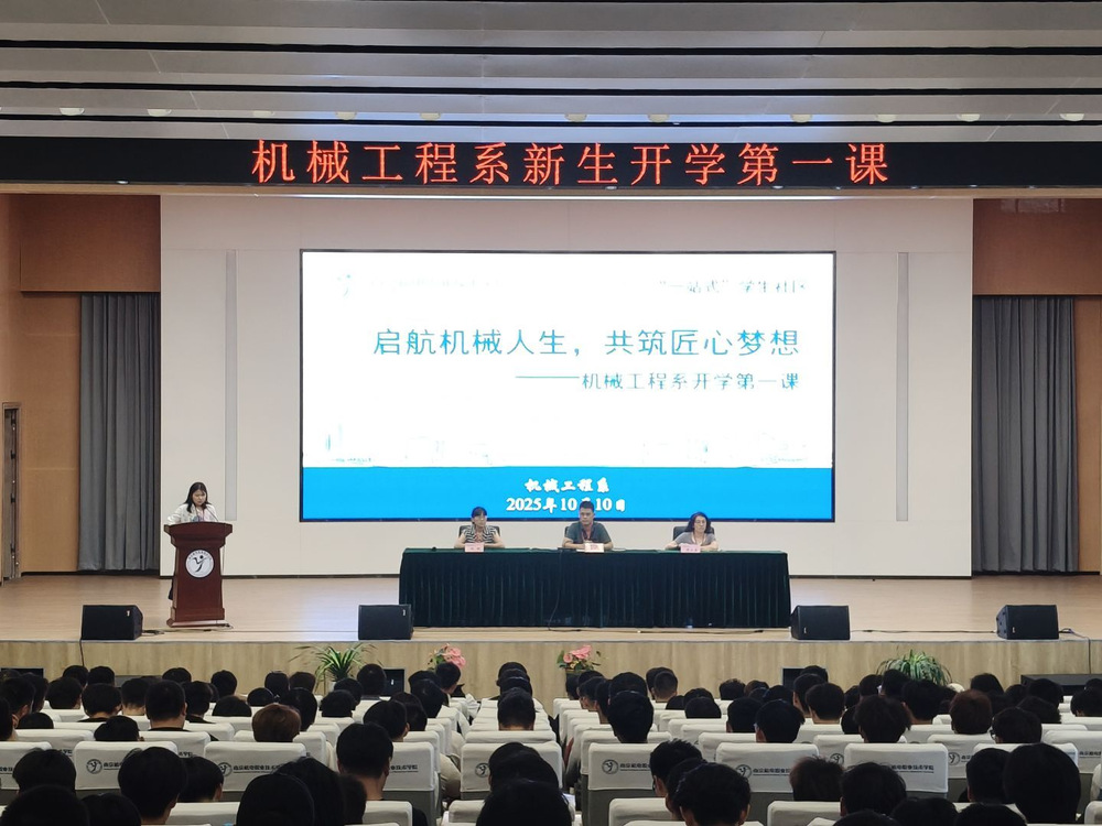 10月10日中午,机械工程系2025级新生开学第一课在乐学楼报告厅举行。会议由学工干事原智慧主持,系主任毛奇、党支部书记胡枫、副主任黄晓萍、团委书记王晨歌通过寄语、规划、安全三大环节,为新生构建大学成长指导体系,助力学生快速融入专业环境、明确发展方向。