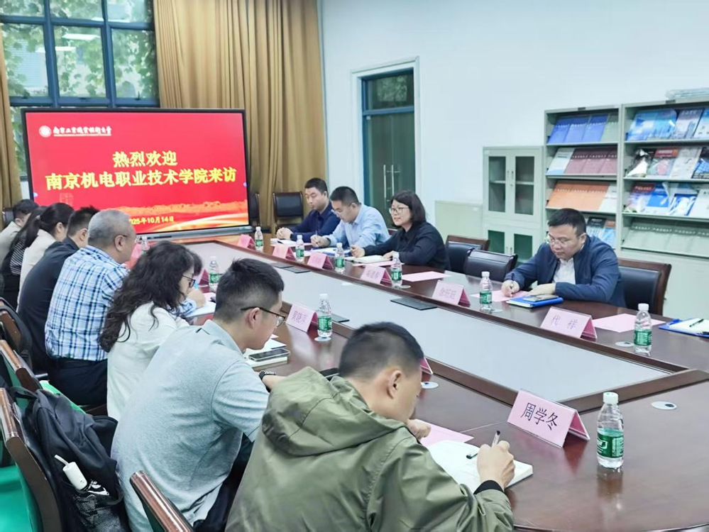 为深入贯彻落实“头雁领航・伴飞同行”1+1 帮扶计划,推动校际资源共享、优势互补,助力机械工程系专业提质升级,2025年10月14日下午,我校副校长刁爱军、机械工程系主任毛奇、副主任黄晓萍携机械设计与制造专业教师团队一行,赴南京工业职业技术大学机械工程学院开展专题研讨。南京工业职业技术大学机械工程学院副院长胡道春、吴修娟、余旺旺,机械设计制造及其自动化系主任杨涛、副主任代祥,专业教师韩腾飞等出席会议,双方聚焦机械设计与制造专业帮扶建设与发展,共商合作举措,开启教育合作新篇章。
