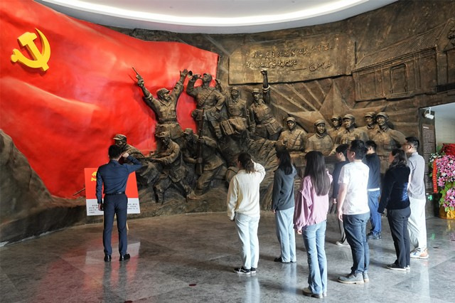 纪念馆门前,全体党员面向党旗重温入党誓词,重忆入党初心,重新接受党性洗礼。