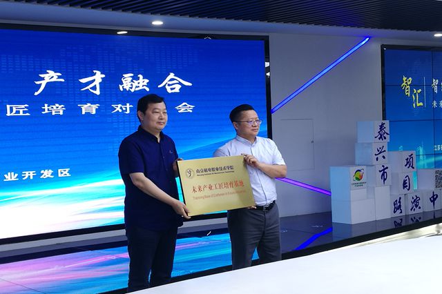 学院副院长刁爱军代表学院与江苏省泰兴高新技术产业开发区签订《产才融合战略合作协议》,学院党委书记、院长周庆礼向江苏省泰兴高新技术产业开发区授予“幻影网页版登录入口_幻影(中国)未来产业工匠培育基地”铜牌。