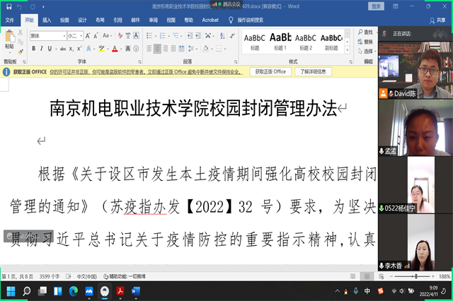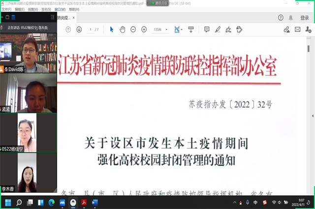 2022年4月11日,为落实江苏省教育厅和学院党委对疫情防控的部署要求,科研及校企合作处李木香处长组织部门全体成员通过腾讯会议认真学习了江苏省《关于设区市发生本土疫情期间强化高校校园封闭管理的通知》和《幻影网页版登录入口_幻影(中国)校园封闭管理办法》等相关文件。重点强调了强化封闭管理、严格执行健康报告制度、做好返校人员资格审核、强化核酸检测、强化快递外卖管理、加强活动管理、加强个人防护等相关规定。