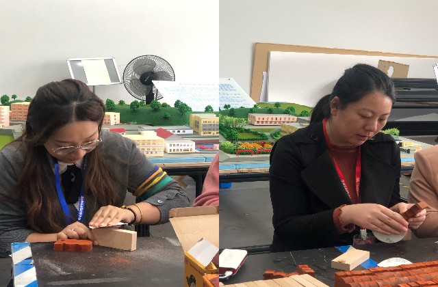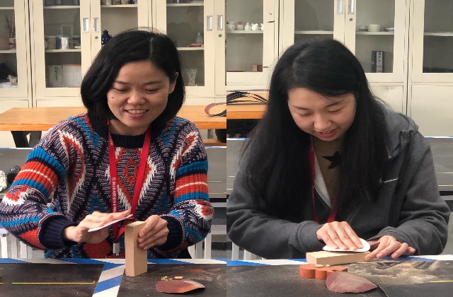然后用抛光布在底座和主体上涂抹木蜡油进行抛光处理。在主体上用电钻安装吸铁石以便于党徽的摆放。最后,使用热熔胶粘黏主体和底座。活动中,教师们仔细打磨,耐心涂蜡抛光,一件件精美的作品在老师们的细心打磨下应运而生。