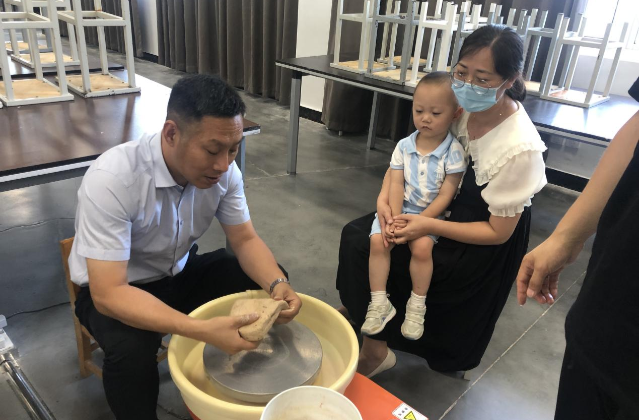 上午进行的是拉坯体验活动,蓝岛创客空间候俊老师介绍了制作的方法和重点。拉坯主要是利用拉坯机产生的离心运动,在旋转过程中,对含水半固化状态的泥料按照设计构思拉伸成型。制作过程中要注意手要稳,定好中心,不跑偏,抚底防开裂,做出形状后整体拔高,最后整理作品的细节。参加活动的教职工及其子女都热情高涨地投入到拉坯的制作中。初次制作的过程中出现了坍塌、开裂、中心跑偏等情况,但是没有人放弃,特别是小朋友们都耐心的一遍遍重头做起,不断总结失败原因,调整自己的制作过程,最终获得自己心中满意的陶艺作品。