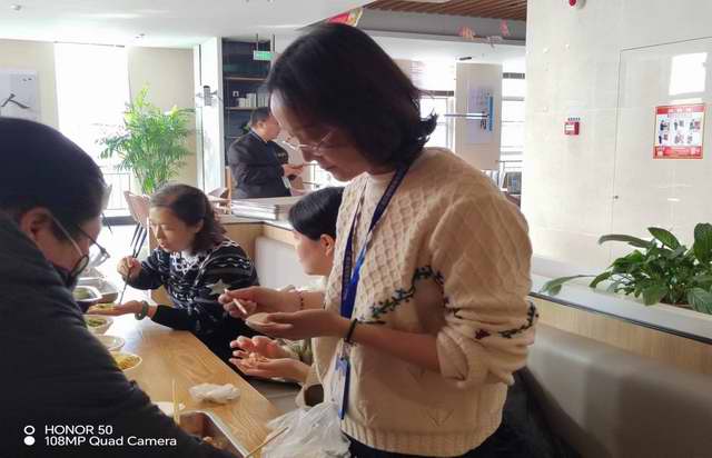 学校后勤处提前给支部备好了猪肉芹菜馅、猪肉白菜馅、羊肉洋葱馅、鸡蛋韭菜馅和饺子皮等材料,大家欢聚一堂,各显其能,包出各式各样的水饺。有鱼形饺、元宝饺、月牙饺、冠状饺;就算包的饺子没有那么饱满精致,但寓意满满。大家一边包着饺子,一边唠唠家常,交流包饺子的经验心得,现场欢声笑语,气氛融融。不一会儿工夫,桌子上就摆满了饺子。小小的饺子,带来一份相聚的温暖,驱赶了冬日的寒意,包进了一年所想、所思,包进了一起走过的记忆,包进了畅想和期盼。暖暖的情,浓浓的意,特别有爱的味道。