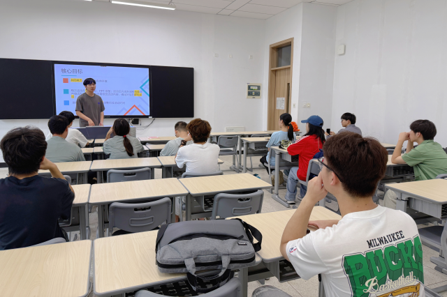 为保障英语第二课堂“蓝岛英”英语角系列活动高效、有序推进,明确工作方向与执行细节,英语第二课堂“蓝岛英”英语角于2025年9月9日在博学楼112举行了第一次工作部署会议。本次会议由董展硕同学主持。