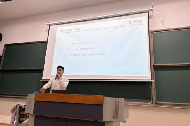 随后,苏展鹏聚焦金融科技应用领域,结合华泰证券的业务实际,为同学们讲解最前沿的金融科技应用知识。他从金融科技如何重塑证券交易模式,到大数据、人工智能在客户画像、风险评估等方面的深度应用,进行了细致且专业的阐述。同时,他还分享了自己在华泰证券担任团队长、私募基金渠道经理等岗位的工作经历,讲述了在这些岗位上如何运用金融科技知识开展业务、服务客户。