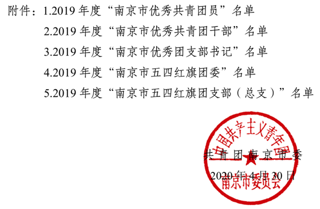 2019年以来,全市各级团组织、团干部和广大团员青年坚持以习近平新时代中国特色社会主义思想为指引,认真学习党的十九大和十九届二中、三中、四中全会精神,深入贯彻习近平总书记系列重要讲话精神特别是关于青年工作的重要思想,紧紧围绕全市建设“创新名城、美丽古都”的总体定位,以“建设青年身边的共青团”为目标,狠抓基层建设、服务中心大局,为南京高质量发展走在全省前列汇聚青春力量,团的各条战线涌现出一大批优秀个人和先进组织。