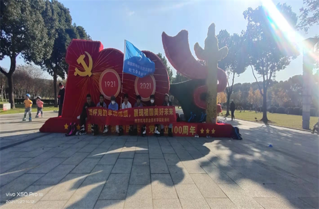 本次活动先是从学校出发,轮滑到团结圩地铁站,坐地铁抵达高淳区,在高淳区落点。社长组织成员们进行打卡。活动过程中,社长手举印有南京机电轮滑社旗帜,带领社团成员排成一列,匀速滑往各个打卡点。一路上,成员们欢声笑语,兴致昂扬,没有抱怨。在阳光的照耀下,在马路的一边形成了一支鲜明的队伍。活动打卡了七个地点,有:湖滨广场、人民广场、高淳老街、福克斯广场……每一个驻足的地方都有着“庆祝建党百年”的标志。