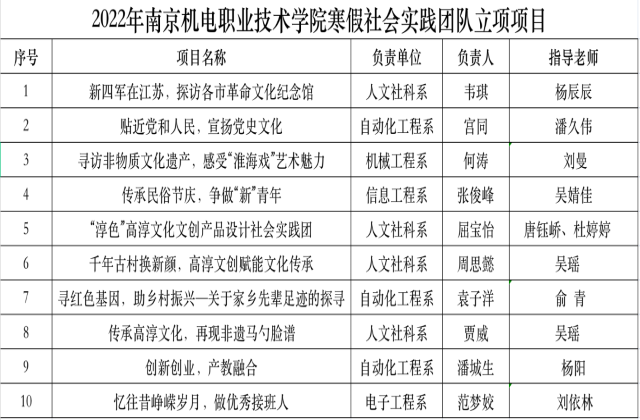 为深入学习贯彻习近平总书记在庆祝中国共产党成立100周年大会的重要讲话精神,进一步推动爱国主义教育与实践育人工作深度融合,引导机电学子以强国一代新青年的良好精神面貌迎接党的二十大胜利召开,庆祝中国共产主义青年团成立100周年。团委决定开展“小我融入大我,青春献给祖国”2022年幻影网页版登录入口_幻影(中国)大学生寒假社会实践活动。经自主申报,各团总支、青马班审核推荐,校级专家评审,确定以下10个项目为2022年幻影网页版登录入口_幻影(中国)寒假社会实践团队立项项目,并对立项的项目给予经费支持,现公示如下: