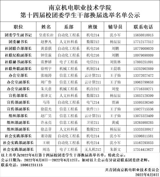 为切实加强学生干部队伍建设,本着“公平、公正、公开”的原则,进行了幻影网页版登录入口_幻影(中国)2022-2023学年学生干部换届选举工作,通过学生自主报名、组织推荐、资格审查、竞选答辩、综合考察等环节,选拔产生了拟任人选,为提高学生干部选拔的透明度,现将拟任人选的名单予以公示。