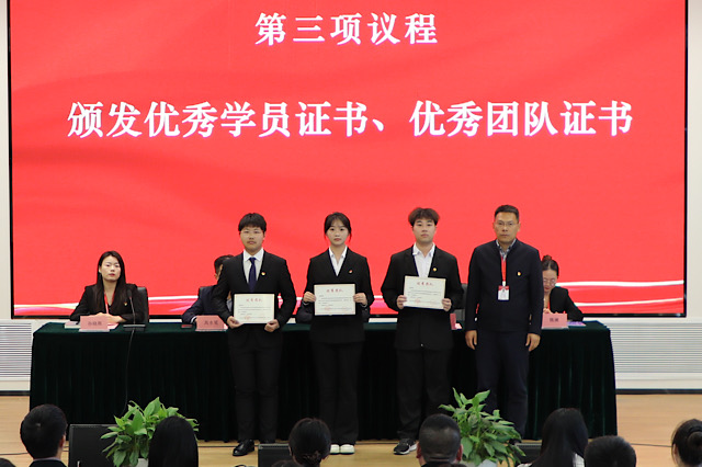 校团委书记孙晓燕宣读了表彰决定并为第四期青马班结业学生代表颁发结业证书,学生工作处处长张宝中为优秀学员代表、优秀团队学员代表颁发荣誉证书,祝贺第四期青马班学员顺利结业。