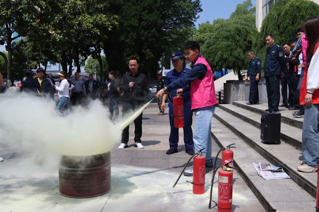 讲座结束后,同学们来到社区广场参加灭火器使用的现场教学环节。从干粉灭火器到二氧化碳灭火器,专家边演示边讲解,详细介绍其适用范围和操作步骤。随后,同学们在专家的指导下纷纷上手体验,他们一开始略显生疏,但在专家的耐心指导下,逐渐掌握了要领。经过一番练习,同学们拔掉保险销、握住喷管对准火焰根部、按下压把,一系列动作干脆利落,火焰瞬间被扑灭。不少同学表示,以前只是在理论上知道灭火器,但实际操作还是第一次,这种体验让他们真正学会了如何使用这个“灭火神器”,在实践中掌握消防技能。