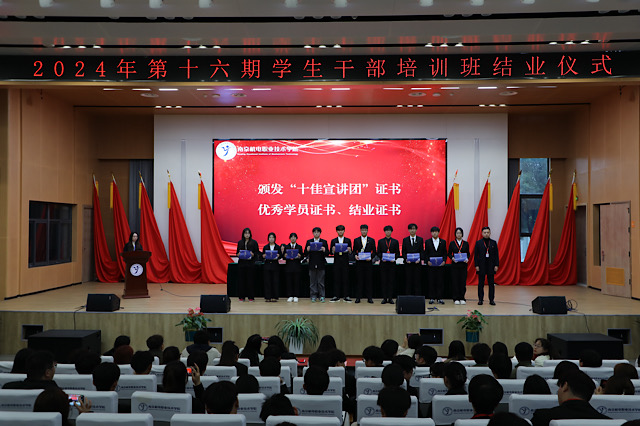 孙晓燕宣读了《2024年第十六期学生干部培训班表彰名单》,授予10个团队“十佳宣讲团”荣誉称号,19名同学“优秀学员”荣誉称号,419名同学结业证书。希望受到表彰的同学争先创优,不断奋发向上,开拓进取,为学校发展作出应有的贡献。