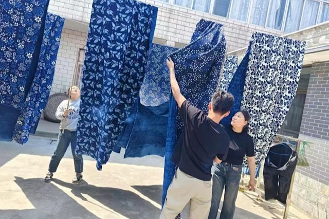 在王老耐心细致地指导下,队员们学习并参与了蓝印花布制作的全套核心工序:从设计纹样的刻板,到用黄豆粉与石灰粉精心调和的防染浆进行刮浆,再到将上好浆的布匹放入深邃的靛蓝染缸中一次次浸染、氧化……每一次浸入与提起,都见证着神奇的变化——洁白的棉布在染液中瞬间被赋予深邃而宁静的“南通蓝”。最后,队员们协助将染好的布匹进行晾晒,看着蓝白相间的美丽纹路在阳光下逐渐清晰、绽放。