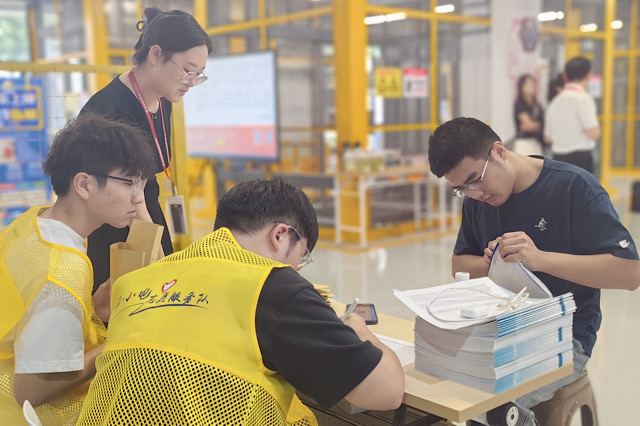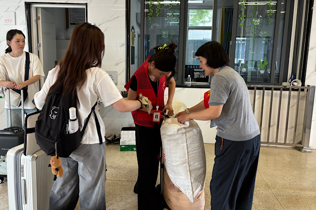 校内宿舍区域,更是志愿者们倾注心力的“服务主战场”。从校门口到宿舍楼下,再到各个楼层的宿舍门口,志愿者的身影不停穿梭。遇到住在高层宿舍且没有电梯的新生,志愿者们毫不犹豫地扛起装满衣物的大箱子,一步一步往上走,汗水浸湿了马甲后背,却始终笑着说:“没事,这点重量不算啥!”进入宿舍后,志愿者们没有立刻离开,而是帮新生一起整理行李——把衣物叠好放进衣柜,将洗漱用品摆放整齐,还会指着宿舍里的设施细细讲解:“这个是空调遥控器,按这里调温度,记得离开宿舍时关掉;这边是电源插座,不要同时插太多大功率电器,注意用电安全。”