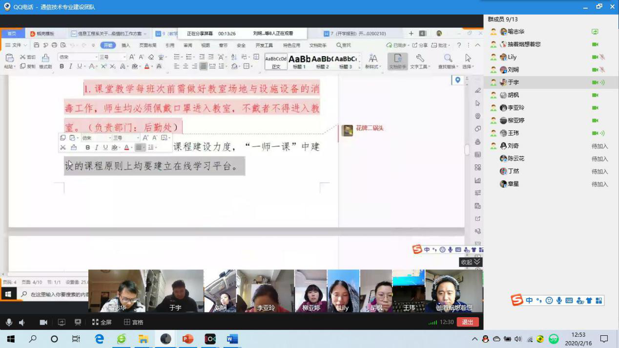会议开始后,首先由喻志华老师对学院下发的《幻影网页版登录入口_幻影(中国)新冠肺炎疫情防控2019-2020学年第二学期教学工作实施方案》《开学前后校门进出工作方案》《开学工作详细实施方案》以及信息工程系下发的《2020年春季学期工作的实施方案》进行了解读。明确了教师的责任和义务。主要提到了,教师上班时需要进行体温测量,体温不正常不准进入校园;进入教室和实训场所授课时必须戴口罩等问题。随后王玮主任对方案进行了补充说明,她表示,通信团队是由专任教师和辅导员共同组成的,团队的每位教师都应提高政治站位,严格按照学院的方案实施,王主任特别提出,并说明了教师需要进行14天的体温测量的工作。最后胡枫书记对学工工作做了进一步的补充,胡枫书记明确提出要确保收集的学生数据真实、准确。